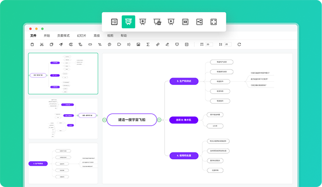 自带幻灯片展示功能,不需要借助其他的工具,就可以进行幻灯片展示。同时支持一键将思维导图拆分成多个幻灯片页面,可以在全屏模式下遍历思维导图的主题或者分支,当思维导图内容较多时,也可以很好的将每个细节展示清楚。