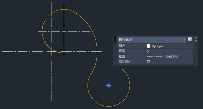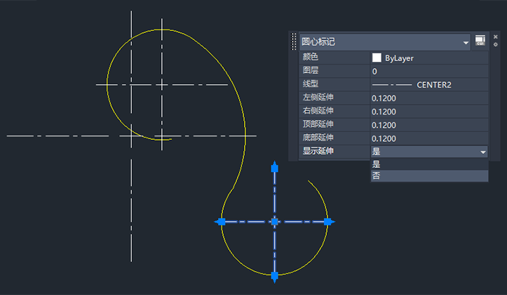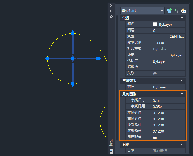 也可以使用“特性”选项板更改特性。在显示“特性”选项板的情况下,选择要查看的中心标记或中心线,然后更改特性(例如,“颜色”、“十字线尺寸”、“十字线间距”、“延伸长度”等)。