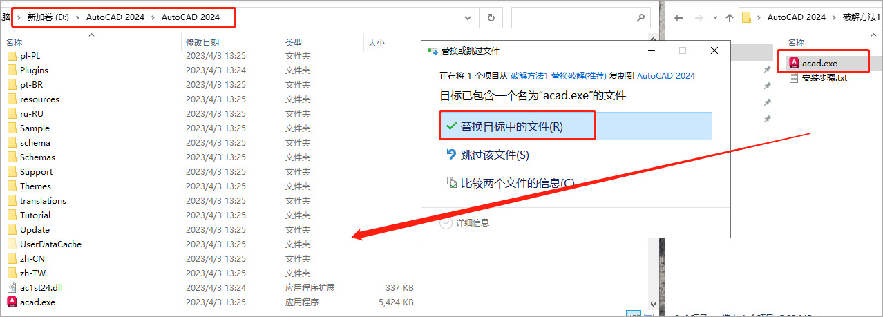 6、接下来开始激活,这里选择第一种方法激活,将破解方法1里面的破解补丁acad.exe复制,然后粘贴到刚才打开的安装目录下替换;