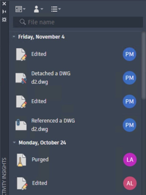 只要在 AutoCAD 中打开并处理图形文件时,“活动见解”功能就会跟踪事件。它还可以跟踪 AutoCAD 之外的一些事件,例如在“Windows 资源管理器”中重命名或复制图形。打开图形时,将从“活动见解”数据库中读取在图形中执行的过去事件,并将这些事件按时间顺序显示在“活动见解”选项板中。同时,当您处理图形时,事件会写入数据库,这将使选项板的内容保持最新。