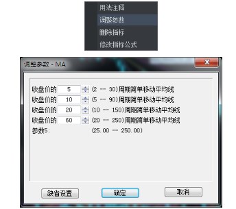 在指标线所在的图形空白处上右击鼠标,在右键菜单中选择【调整指标参数】选项,在弹出对话框中修改参数。