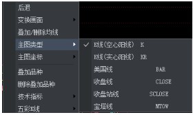 在技术分析画面空白处点击鼠标右键,在右键菜单中展开【主图类型】选项,可以选择K线(空心阳线)、K线(实心阳线)、美国线、收盘线、收盘战线、宝塔线的K 线形态。