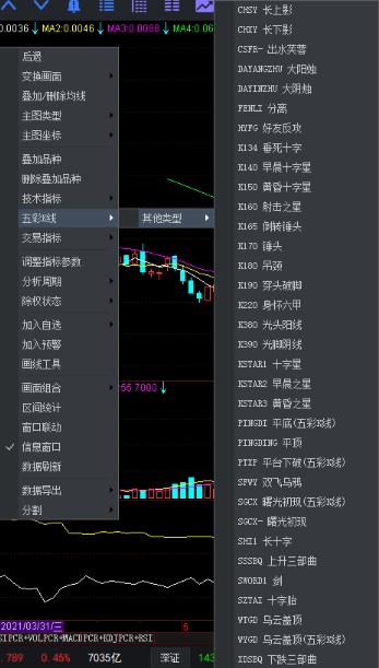 调入五彩K线可在K线图上直接右击鼠标,选择其中的五彩K线,并展开选择某一种彩K线模式,即可将当前K线图变换成此种K线模式。