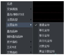 华泰证券衍生品交易系统软件在技术分析画面空白处点击鼠标右键,在右键菜单中展开【主图类型】选项,可以选择普通坐标、等比坐标、等分坐标、百分比坐标、对比坐标、黄金分割坐标。