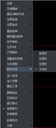 除权、复权处理可选择在技术分析画面右键菜单中选择【除权状态】的展开选项。