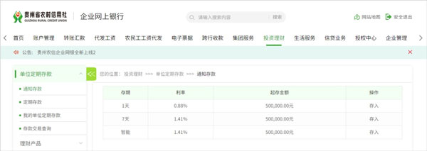 该板块为新增板块,具有单位通知存款、存款交易查询、理财产品功能。用户可根据需求点击相应功能菜单操作。