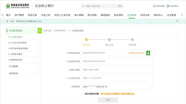 社保税费服务:提供社保税费代扣的签约查询、解约功能、签约用户实现银行代扣,企业也可以查询社保税费欠费并进行缴款,还可查询社保税费服务记录。