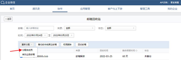 8、回收邮箱:若是需要更换邮箱绑定的企业微信账号,可以通过回收邮箱功能,将成员邮箱回收进回收站,再次重新分配给其他企业微信账号绑定使用。