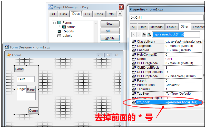 6、一开始的试验,验证了属性表达式中调用的函数必须在当前路径下,或者 h 可以找到(例如,你可以启动 后运行一个单的 prg来 set default to ..,或用 set proc to ..或 set path to...将这 resizer.prg 放置在可搜索的过程或路径中); 我们这里使用另外一种方式定义一个设计时用的全局变量 goResizer,并让它在 vi 启动时自动加载到设计环境中,这样就可以不再受 curdir小 的影响,因为它已在内存中了,