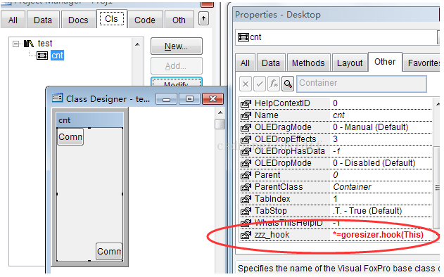 1)关键一步:给这个容器添加一个名为 Zzz ook 的设计时钩子属性,属性值为=goResizer.hook(This),因为现在我们只希望这个控件在表单设计器上拥有设计时 anchor 行为,而不是在类设计器中,所以在这个控件类的 zzz hook 属性值前加了一个号注释掉它,
