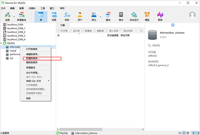 2、选中下面任意数据库,单击鼠标右键,选择新建数据库;