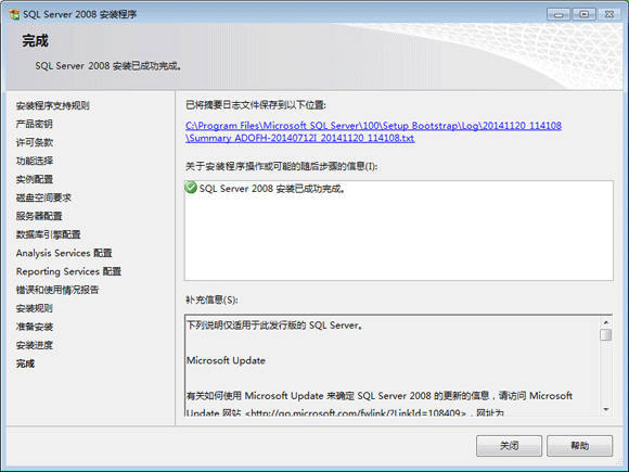 20、此时SQL Server 2008完成了安装,并将安装日志保存在了指定的路径下。