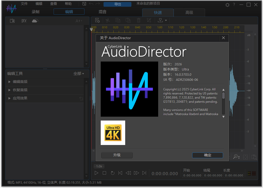 7、好了,软件成功激活,用户可以免费使用CyberLink AudioDirector Ultra 2026中文特别版啦。