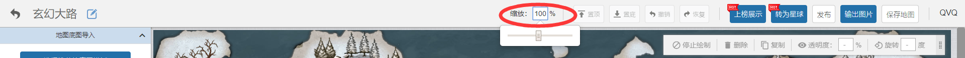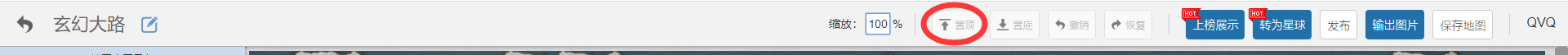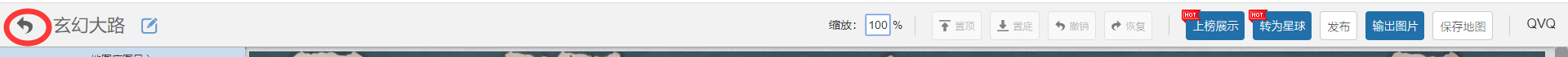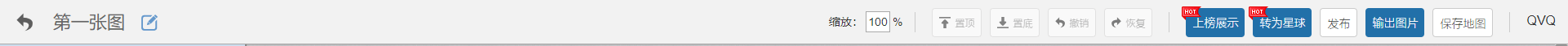 进入绘制界面,呈现在页面顶部的菜单栏为绘图基本工具,主要实现返回上一页面、信息修改、缩放、置顶、置底、撤销、恢复、分享发布、输出图片、保存地图等基本功能。