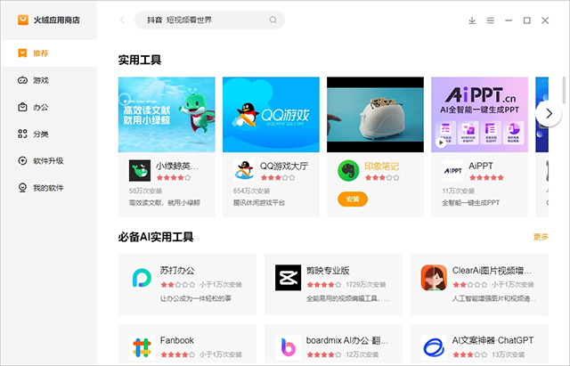 火绒应用商店电脑版是一款应用层序下载更新软件,该软件基于火绒一贯的风格应该也是相对干净的软件,为用户提供了一个安全、方便的渠道,让用户可以浏览和下载各种应用程序,包括游戏、工具、社交媒体等等,是专门为电脑用户打造的软件,界面更加简洁,软件种类更加齐全,满足用户的所有下载需求,同时还能够直接卸载和更新软件,丰富、优质的应用软件、游戏和快应用,满足用户办公、学习、娱乐等多场景互动体验。