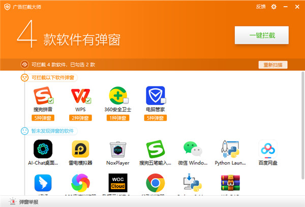 1、自动拦截软件广告弹窗。