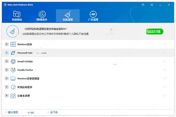 Wise Anti Malware保护系统的同时,还可以进行系统的清理。帮助系统清理磁盘、删除临时文件、清理系统无用的应用程序、清空网页历史记录、缓存文件、cookies等,既保护了个人隐私,也释放了更多的磁盘空间,同时也提高了系统运行速度。