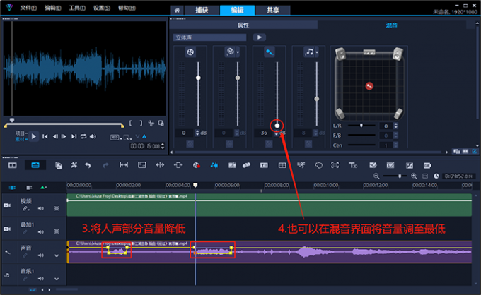 会声会影视频编辑软件的波形编辑功能,可以帮助我们消除音频中较为突兀的人声。