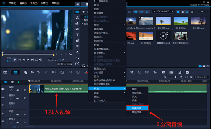 1、首先,将视频素材插入会声会影,右击素材选择“分离音频”。