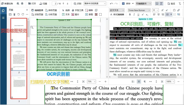 4、识别完成后,页面呈现四个不同的区域,分别为:页面缩图预览、扫描框内文字预览、OCR识别前、OCR识别后。