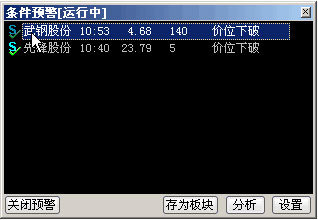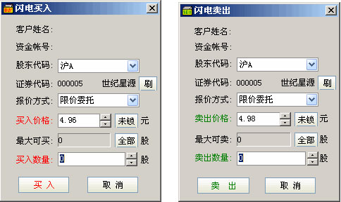 (3)在预警列表上双击“价位下破”或者“价位上破”的股票项,将弹出闪电卖出或者闪电买入的对话框,如下图: