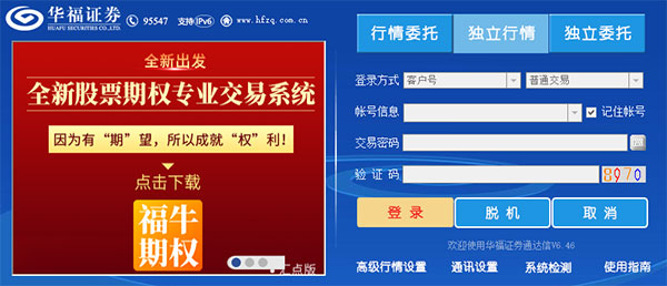 独立交易:需填入资金账号、交易密码、验证码,登陆后只进入交易界面,不显示行情;