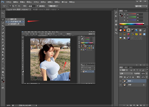 3、之后选择”多边形套索工具“,选中一块你需要填充颜色的区域。