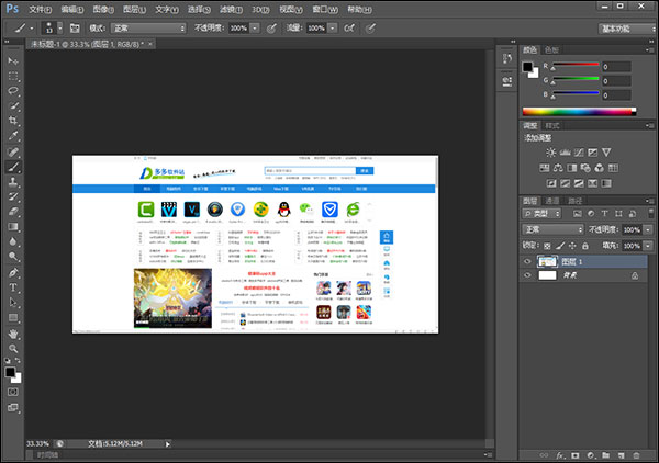 图像编辑窗口:中间窗口是图像窗口,它是Photoshop的主要工作区,用于显示图像文件。图像窗口带有自己的标题栏,提供了打开文件的基本信息,如文件名、缩放比例、颜色模式等。如同时打开两副图像,可通过单击图像窗口进行切换。图像窗口切换可使用Ctrl+Tab。
