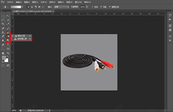 2、成功插入图片后,在左侧工具栏找到【油漆桶】标志,一般是跟【渐变工具】在一个项下的。