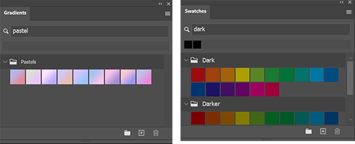 “画笔”、“色板”、“渐变”、“样式”、“图案”和“形状”面板中现在包含搜索功能,这样您可以花更少时间搜索特定预设,并将更多时间用于创意。