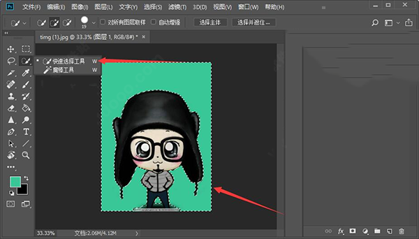 3、接下来在左边工具栏中选择红色箭头所指处的“快速选择工具”,将图片中不需要的地方选中,下面以绿色背景为例演示。