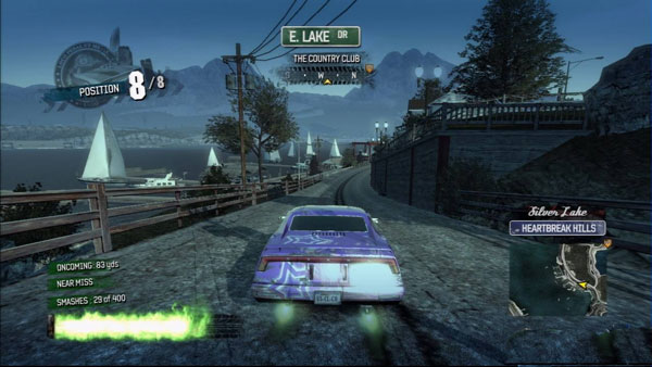 顾名思义就是进行各种特技表演,除了普通的漂移、高速下使用氮气加速等用来维持分数连锁的手段外,super jump、billboards(就是撞收集要素里的那个广告牌)、Flat spins、big air和barrel rulls都是加分的大头,也就是说一定要对收集要素的所在地熟悉才能得到高分,收集要素中隐藏通路的护栏也可以用来维持连锁,不过分不高。