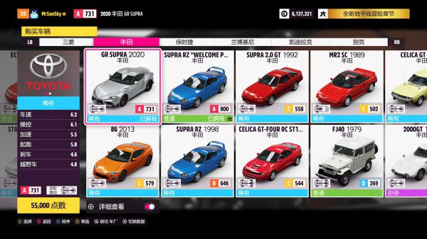 我用的是道奇的69年charge rt极限竞速特别版。熟练度左下角的1点和三点加了就行,有条件的可以多一条命。需要改成四驱拉力风格的那种。懒得调的直接抄 180 711 539(需要开阔和平坦防止撞到岩石和跌落土坡掉分)