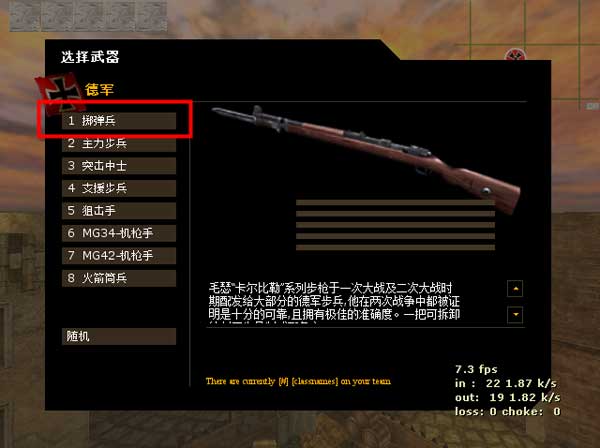 二战中最好的狙击枪之一,这个兵种几乎能够击败所有冲锋。一个好的位置是这个兵种生存的关键,咬住敌人并且转移。如果在一个地点呆的时间太长,您枪口的闪光将让您升天。