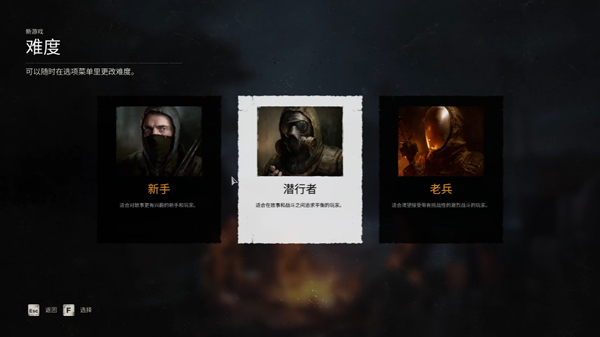 1、打开潜行者2切尔诺贝利之心游戏,点击新游戏,选择游戏难度,支持新手、潜行者、老兵三种难度;