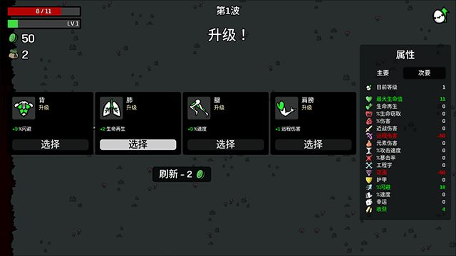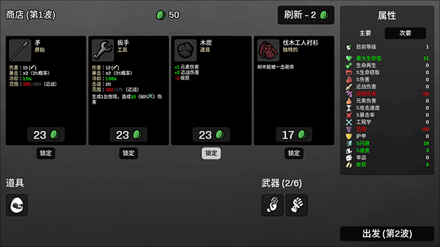 面板分析,道具价格+50%再加上+200%的经验获取的意思就是让你主要通过升级来获取属性而非道具,钱主要用来刷新、买武器和买机制类道具(比如长胡子的婴儿/头巾/跳弹)。