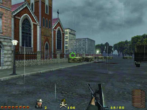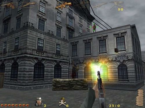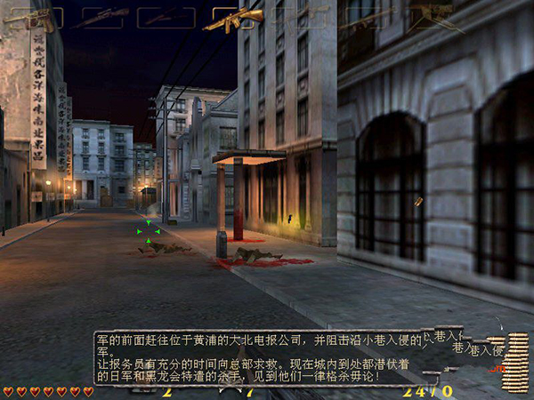 进入里面的广场,要对付每栋楼上众多鬼子,用冲锋枪容易解决他们,第三栋楼最后同时出来六个鬼子,火箭筒打其实不方便,用轻机枪可以一次扫死一排的。最后的BOSS是一辆97式坦克,难度很大,只能利用火箭筒和手榴弹来对付,边上的鬼子用冲锋枪和轻机枪对付,主角自动利用掩体保护自己,中途有一次机会补充弹药,还可以捡到几个医药包,坦克向你冲来的时候,全力开火会把它打回去,坚持它转两个圈后,你的弹药耗尽,跑到左边的防护栏架起重机枪继续攻击,不停的打坦克,有鬼子出来打鬼子,耐心和敌人周旋就能取胜了。