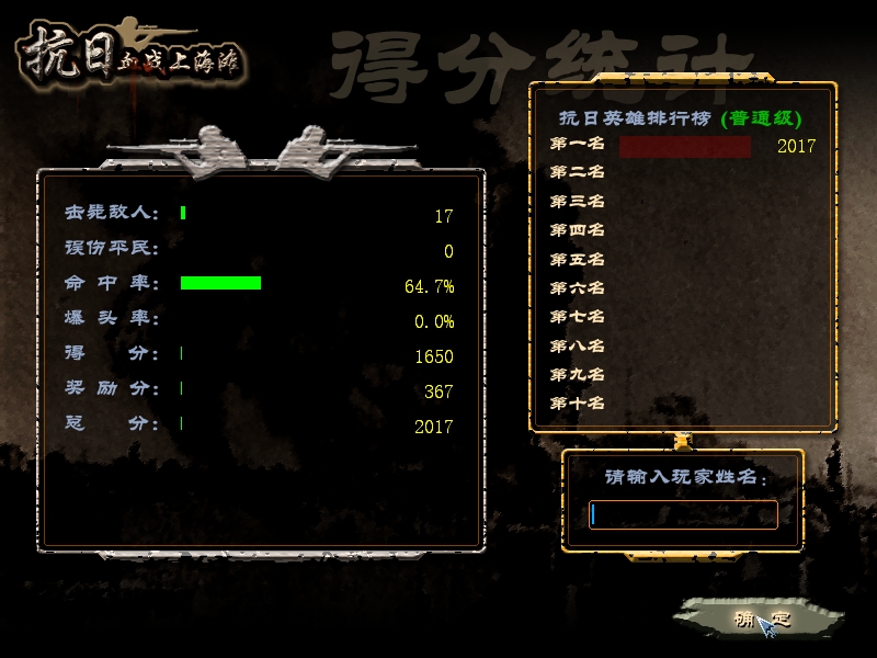 2、鬼子机枪手(有头盔防护,用歪把子轻机枪或马克沁重机枪攻击)和鬼子投弹手(向你投掷手榴弹,手榴弹可以在空中打爆):最低分60,爆头170,普通120,有时可将其头盔打掉,但硬直数秒后会继续攻击,失去头盔时爆头250