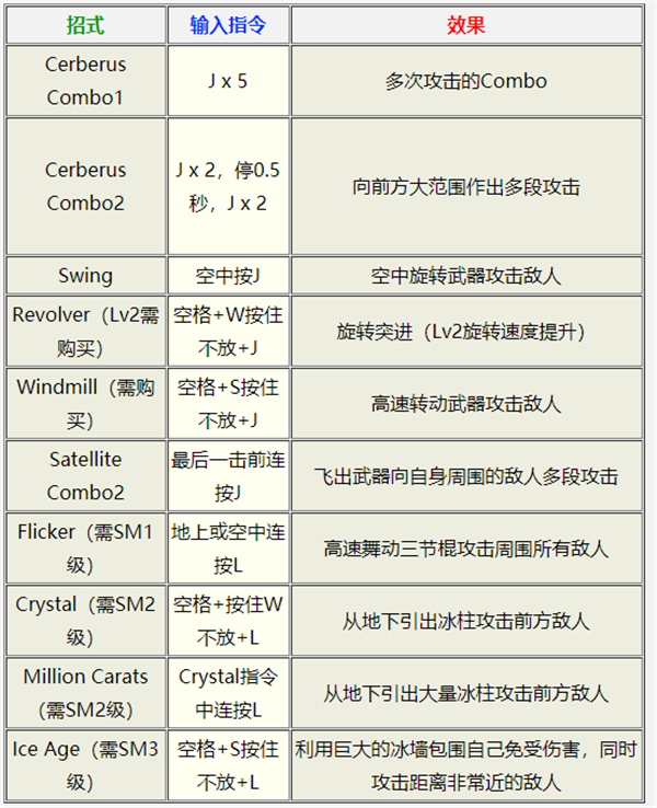 Starfall(空中按J),就是空中的速降飞腿(但丁也会),游戏初期就会,威力不错,而且即使与敌人相杀后还能弹回半空,再次使用,升级为LV后威力变大,速度更快。