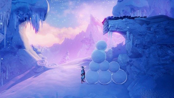 之后你会来到悬崖下面,这里也不难,如下图,将雪球堆在下面,