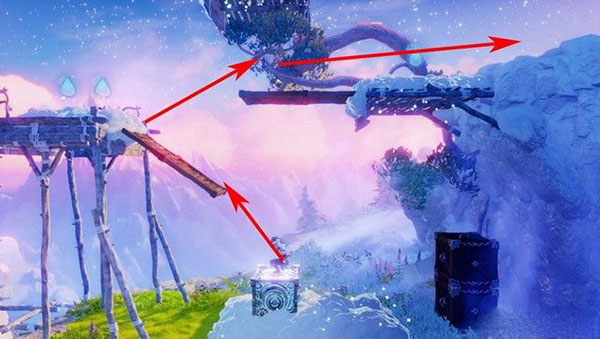 然后将召唤的大箱子放在最下面,如下图箭头顺序,先利用大箱子跳上第一块木板,