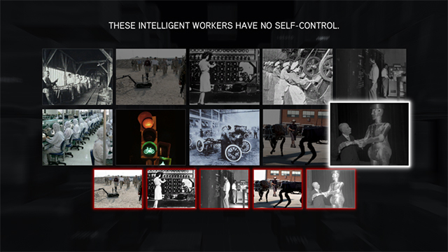 第一个转盘:图像由「宁静的森林」变成了「杂乱的工地」。伴随有「人需要商品,而它们都是由劳动人民创造的,它们基本上都是合作分工,而不是单独呆在一个国家。这里面几乎没有任何转让闲置,如果我们需要劳动力,那么就去找他们好了」的文字记录。