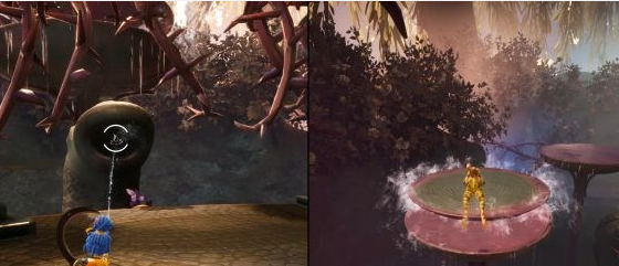 首先,青蛙不溶于水,所以不要掉进水里,这关的难点是喷水石像,两人在两侧轮流踩石板通过即可。
