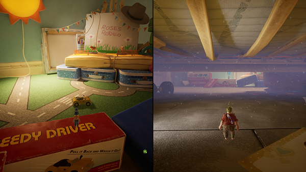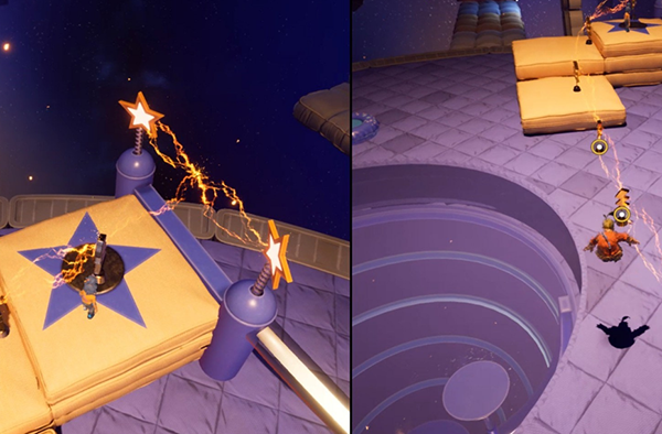 然后科迪变小到刚刚小梅那端变正常,之类可以变小被踩飞,获得第二个隐藏成就,小梅从上边跳下来,把科迪踩上去。
