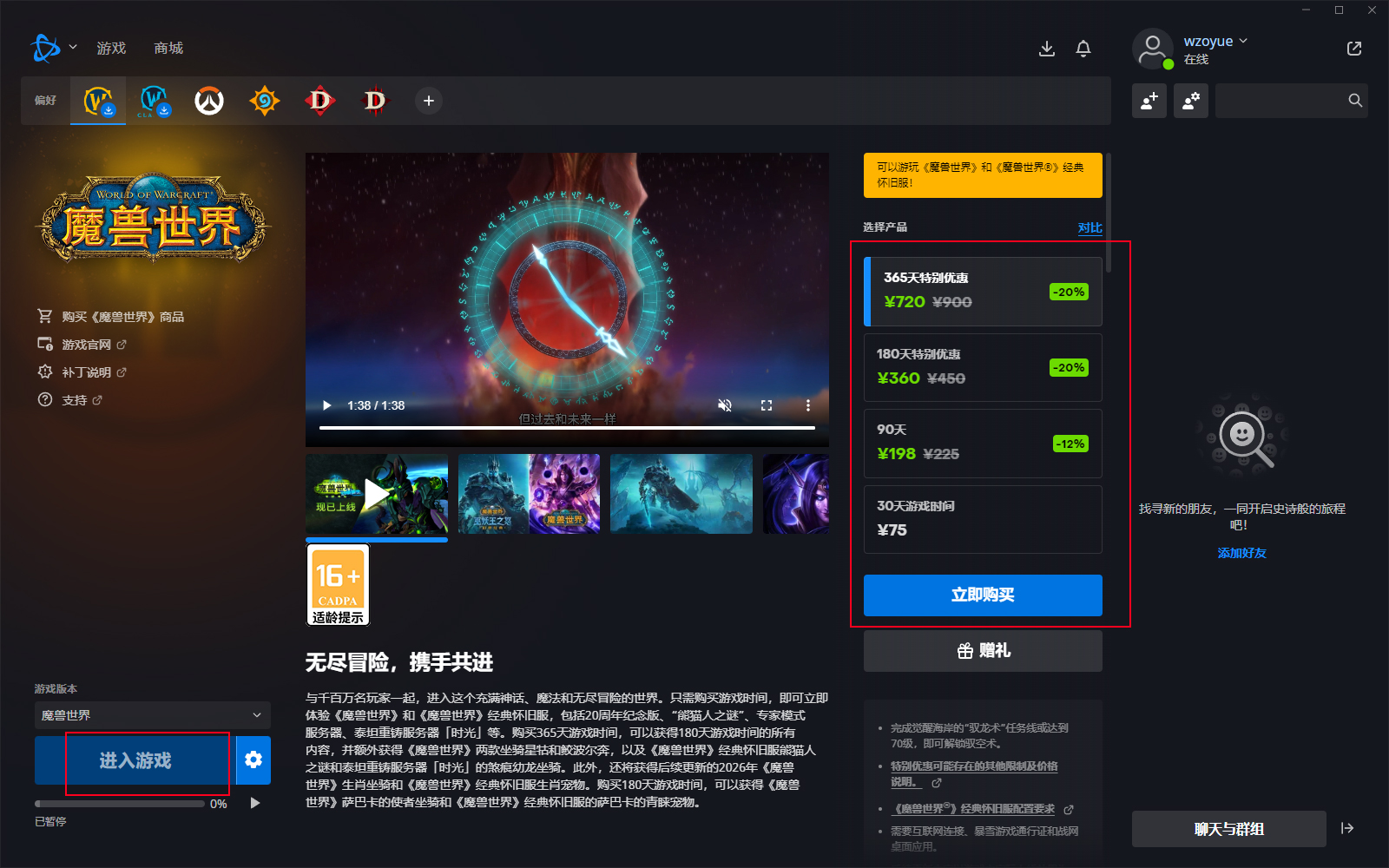 免费试玩仅仅是个开始。购买《魔兽世界》游戏时间才能继续后续的升级之路,在这个不断扩展的宇宙中解锁更多版图、世界和维度,还能进入忠实地重现了原版《魔兽世界》的经典怀旧服。