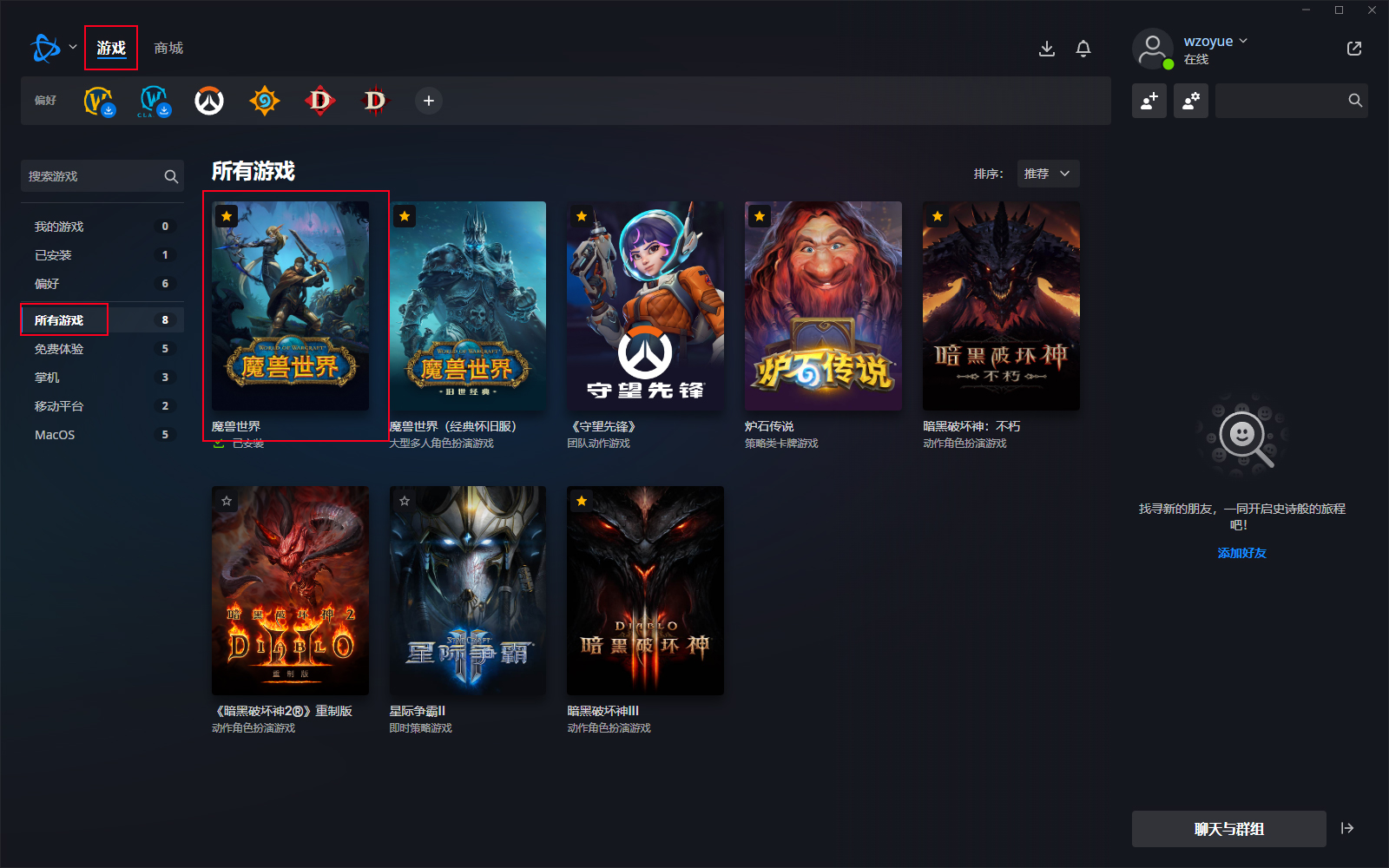 3、成功登陆后,依次点击游戏--所有游戏--点击第一个魔兽世界安装;