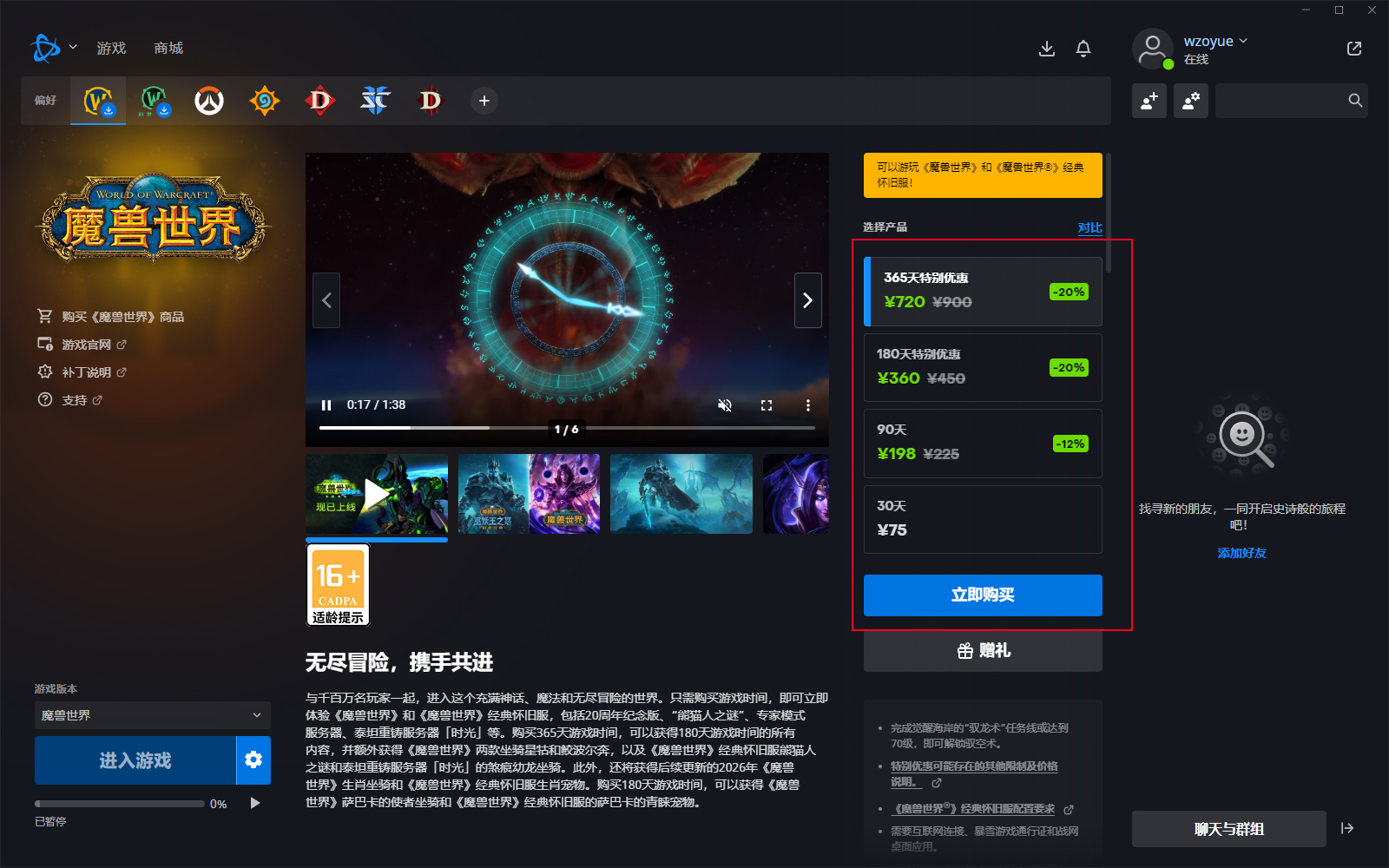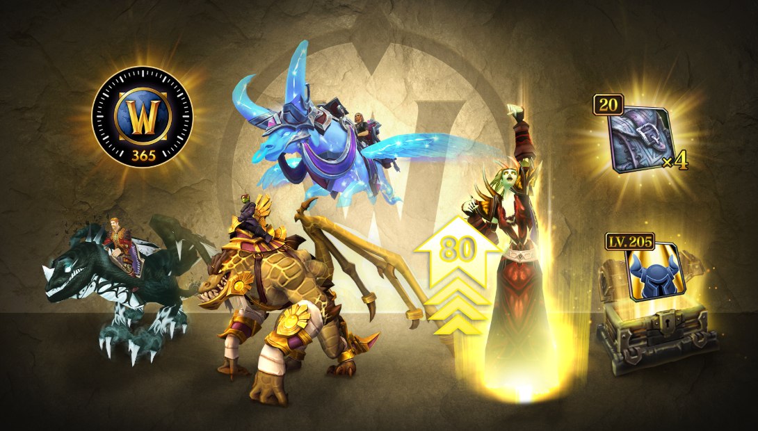 拥有时光启程典藏年卡,您将获得魔兽世界游戏时间365天特别优惠中所有商品以及1次可以用于泰坦重铸服务器「时光」80级直升服务