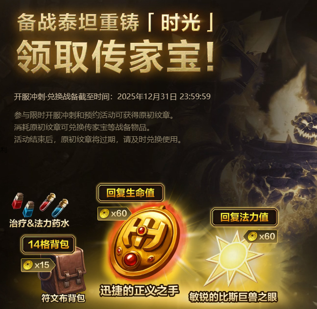 魔兽世界泰坦重铸时光服已经上线了,玩家可以进入这个充满神话和冒险的世界,扮演强大的英雄,挑战各种高难度怪物和地下城。官方为了帮助玩家备战熔火之心团队副本,特别发放泰坦余烬,满级玩家还能额外领取20个,总数量可达40个!此外,新人玩家在等级提升期间还能享受双倍经验值和声望加成,快速升级不再是梦。
