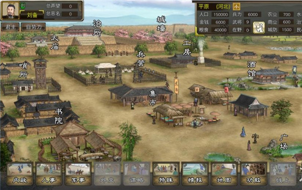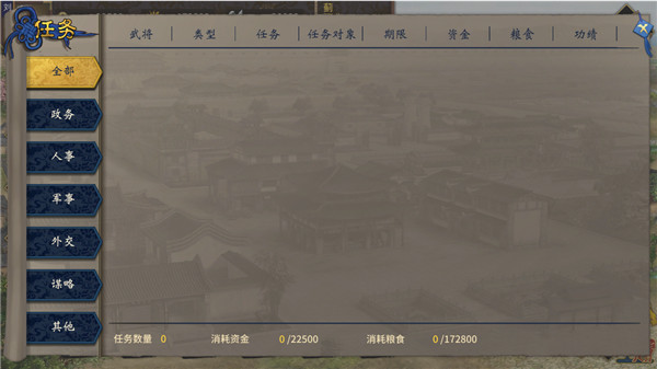 - 主界面:显示当前选中的城池信息、资源情况以及任务目标。