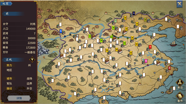 探索是增加玩家对地图的信息力的,游戏里分为6个地区,当玩家占据某个地区的城池之后,就能派人探索这个地区,探索的信息与武将的【人脉】【仁德】有关,探索可以获得大量装备打造材料,酒,玉,书等宝物。探索最关键的事能探索到在野武将,在野武将可以通过登庸变为玩家手下的将领。玩家一开始,探索这一项必须做,这是武将来源的基础,除了主动投靠的,所有在野武将都是需要探索出来的,一探索出来就要立马派人前去登庸,不然会被ai捷足先登。武将是玩家前期发展的基础,武将数量多,任务才能转动起来。